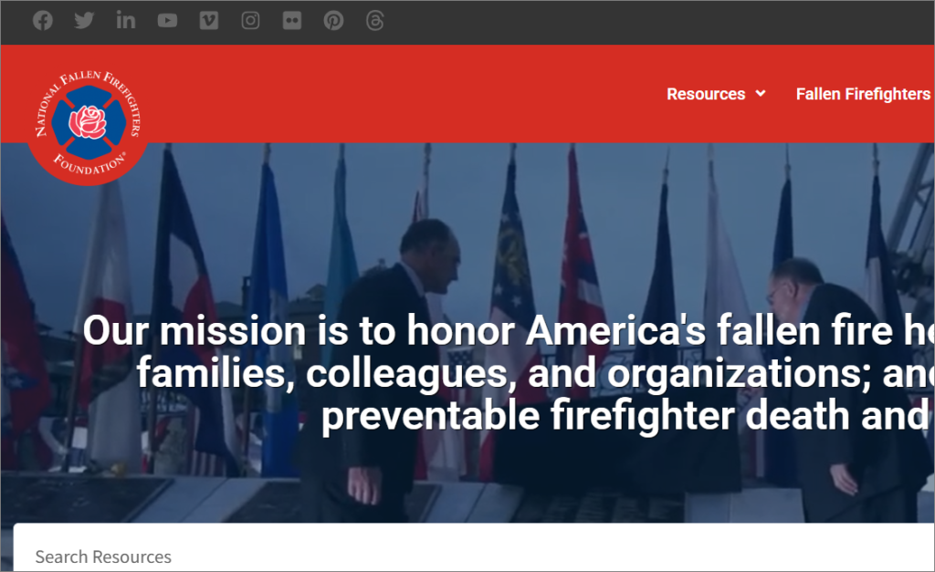 The National Fallen Firefighters Foundation website (firehero.org) honors firefighters who died in the line of duty and supports their families through programs, resources, and memorial events. It also works to improve firefighter safety and reduce preventable injuries and deaths.