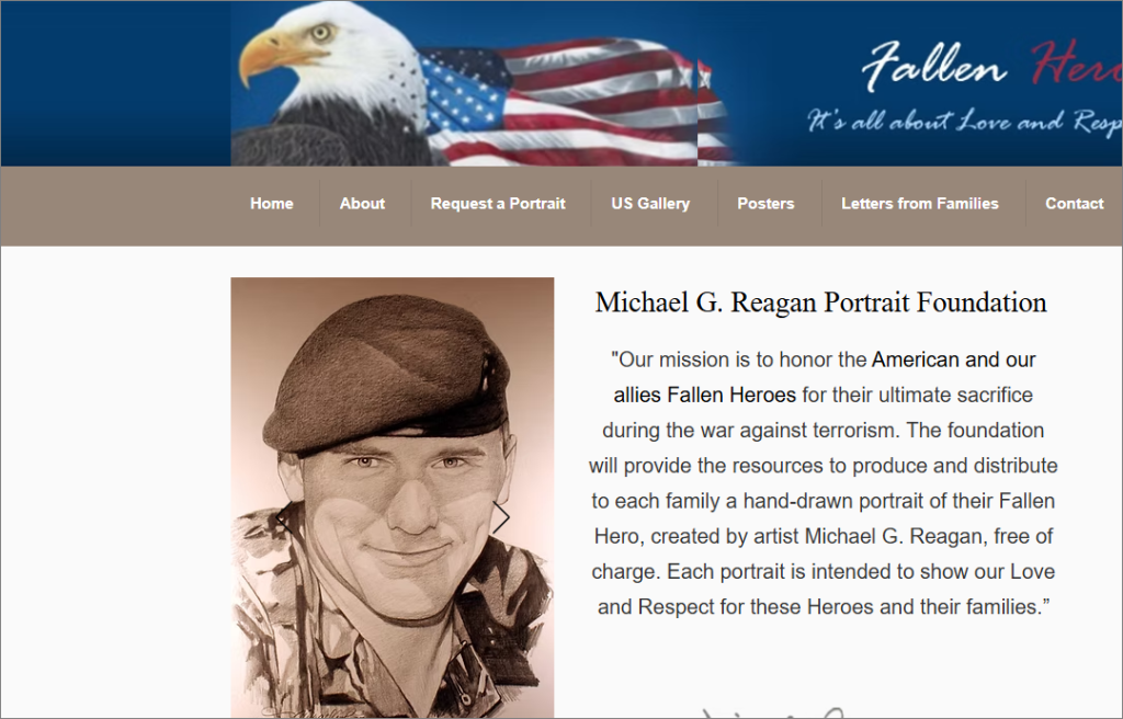 The Fallen Heroes Project website honors military members who died in service by providing free, hand-drawn portraits to their families, created by artist Michael Reagan. It also shares information about the project’s mission, showcases memorials, and offers ways to request portraits or support the cause through donations.