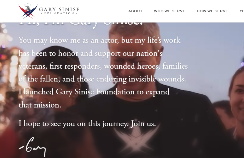The Gary Sinise Foundation website highlights a nonprofit organization dedicated to supporting veterans, first responders, and their families through programs that provide housing, mental health support, and community services. It also shares stories, resources, and ways for people to donate or get involved in honoring those who serve.